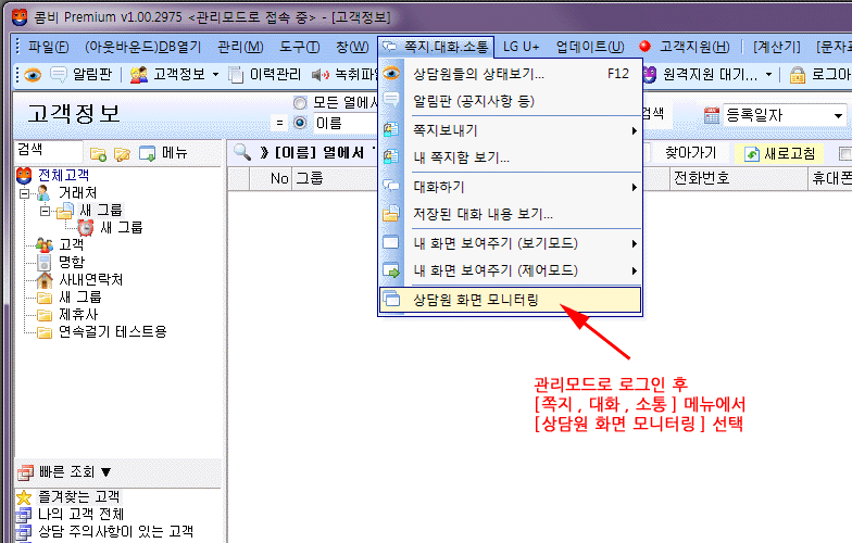 »ó´ã¿ø ȸéÀ» ¸ð´ÏÅ͸µ ¶Ç´Â Á¦¾îÇÏ·Á¸é "°ü¸®¸ðµå·Î ·Î±×ÀÎ" ÈÄ [ÂÊÁö.´ëÈ.¼ÒÅë] ¸Þ´º¿¡¼ [»ó´ã¿ø È¸é ¸ð´ÏÅ͸µ] ¸Þ´º¸¦ ¼±ÅÃÇÕ´Ï´Ù.