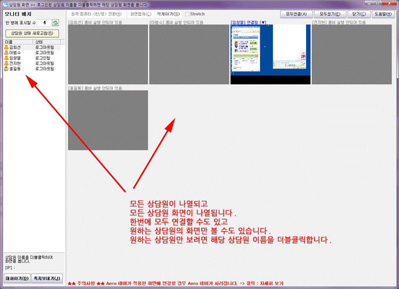 °ü¸®¸ðµå·Î ·Î±×ÀÎÇÏ¸é »ó´ã¿øµéÀÇ È¸éÀ» ¸ðµÎ ¸ð´ÏÅ͸µ ¶Ç´Â Á¦¾î ÇÒ ¼ö ÀÖ½À´Ï´Ù.